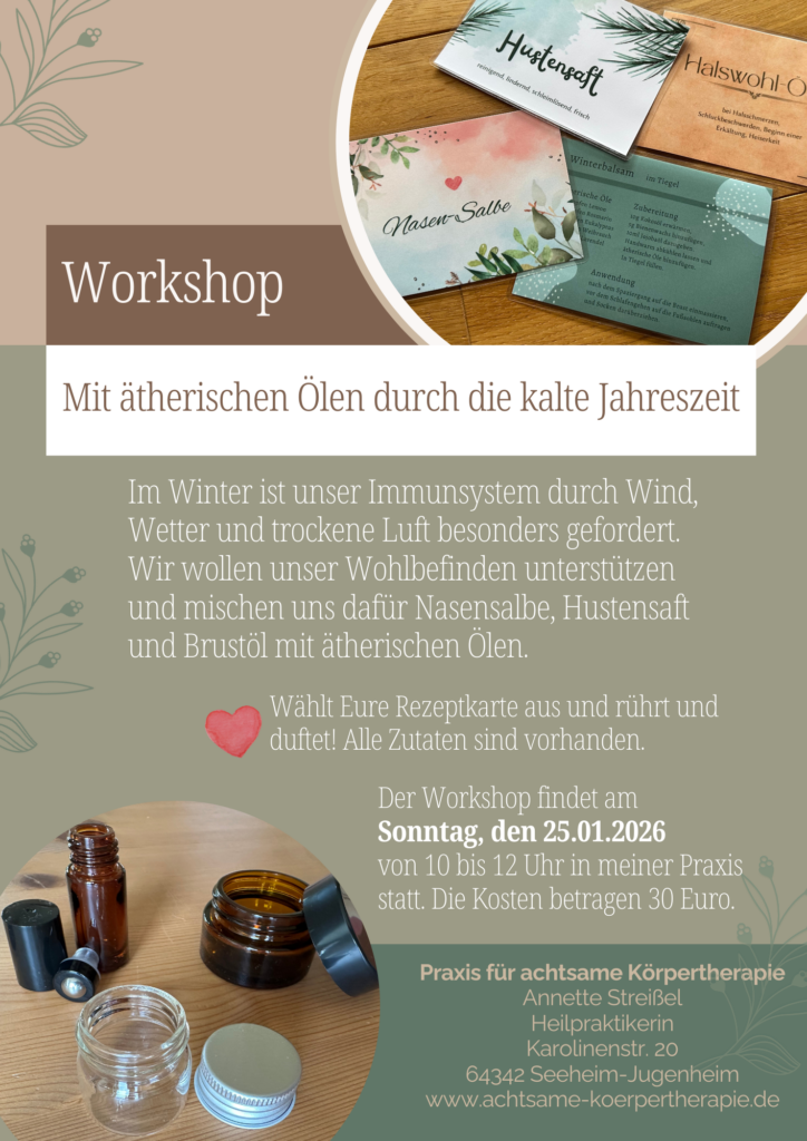 Der Termin ist Sonntag, der 25.01.26 von 10 bis 12 Uhr. Der Workshop findet in meiner Praxis statt: Karolinenstr. 20 in 64342 Seeheim-Jugenheim. Die Kosten betragen 30 Euro.